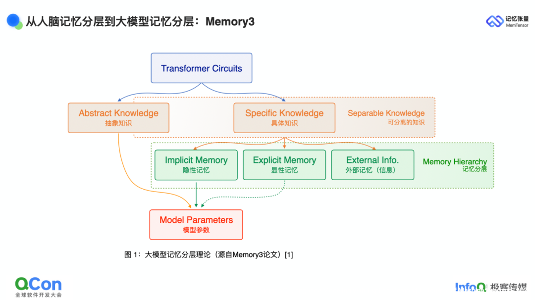 基于上述启发,我们在 2024 年 7 月发布了首个分层架构的大模型。其核心理念是把 Transformer 中的参数化记忆拆分为抽象知识与具体知识,并进一步把其中可分离的部分抽离出来,使模型主干尽可能轻量化。主干只需保留最关键的推理能力,其余具体知识则交由外部存储管理。据此,我们将记忆划分为隐性记忆、显性记忆与外部记忆三类,通过分层降低推理与记忆负载。