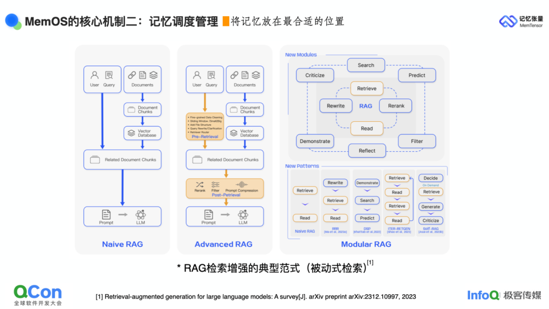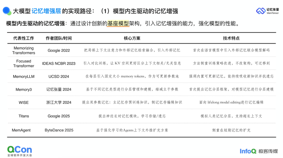 第一条是模型增强范式:从模型架构与训练范式本身入手,让训练后的模型对记忆具备更强的理解与编排能力。我们团队早期便尝试以记忆分层的方式建模,以提升记忆管理与唤起的效率;近期,字节跳动等机构也尝试利用强化学习来优化记忆使用范式,重点解决短期记忆与长期记忆的协同问题。这一路线可称为"基模驱动"的记忆优化。