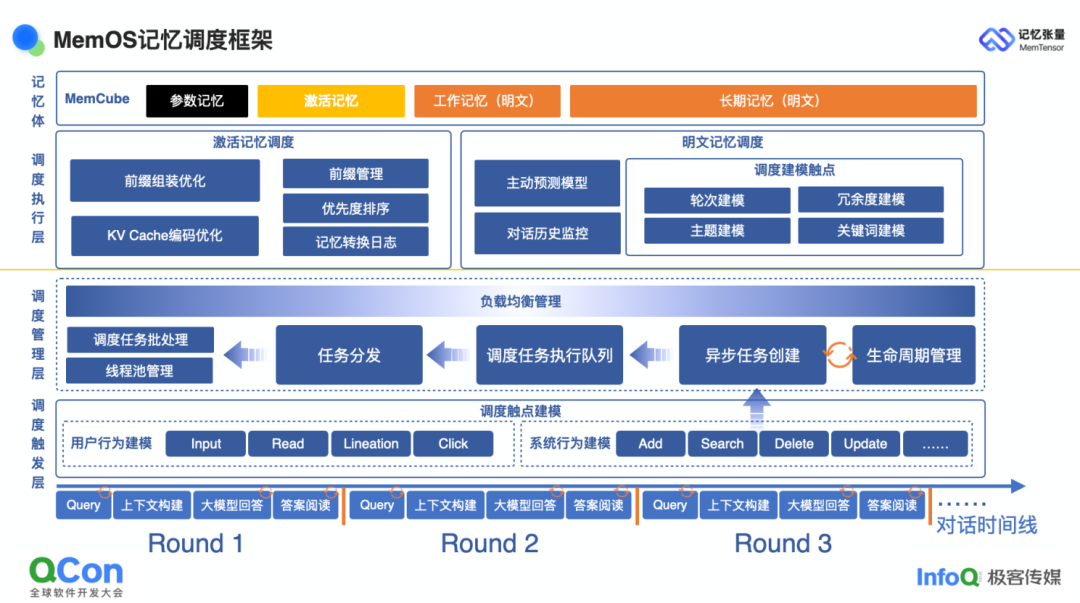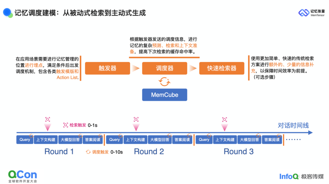 为支撑这套调度框架,我们配套实现了消息队列、动态埋点与主动预测算法,使系统始终面向 memory-ready 状态:用户随时提问,背后的 Memory Cube 都已处于最佳形态,时延被压到最低。