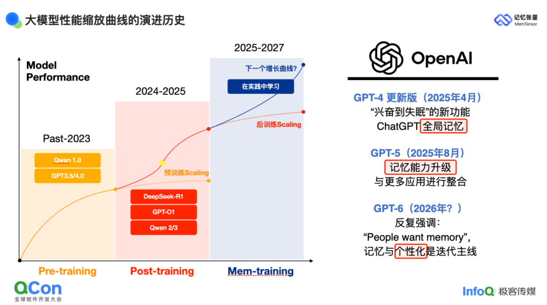 之所以选择"记忆"作为主攻点,根本原因在于我们判断:在大模型的演进史中,记忆将成为与 MCP 工具并列的下一个关键增强维度。2023 年以前,业界普遍通过扩大数据规模、参数量和训练量来换取性能提升,由此催生了千问、ChatGPT 等代表性范式。进入 2024–2025 年,人们逐渐发现,单纯堆参数与规模带来的收益开始递减,于是转向"后训练"与"推理增强",DeepSeek-R1 便是这一阶段的典型产物。当后训练也逼近瓶颈时,Sam Altman 等人开始追问:下一步的突破口究竟在哪里?在 GPT-4 的更新日志里,OpenAI 把"全局记忆"列为令团队"兴奋到失眠"的新功能;而在 GPT-5、GPT-6 的路线图中,“记忆"与"个性化"被反复提及,被视为大模型面向应用场景的核心变量。