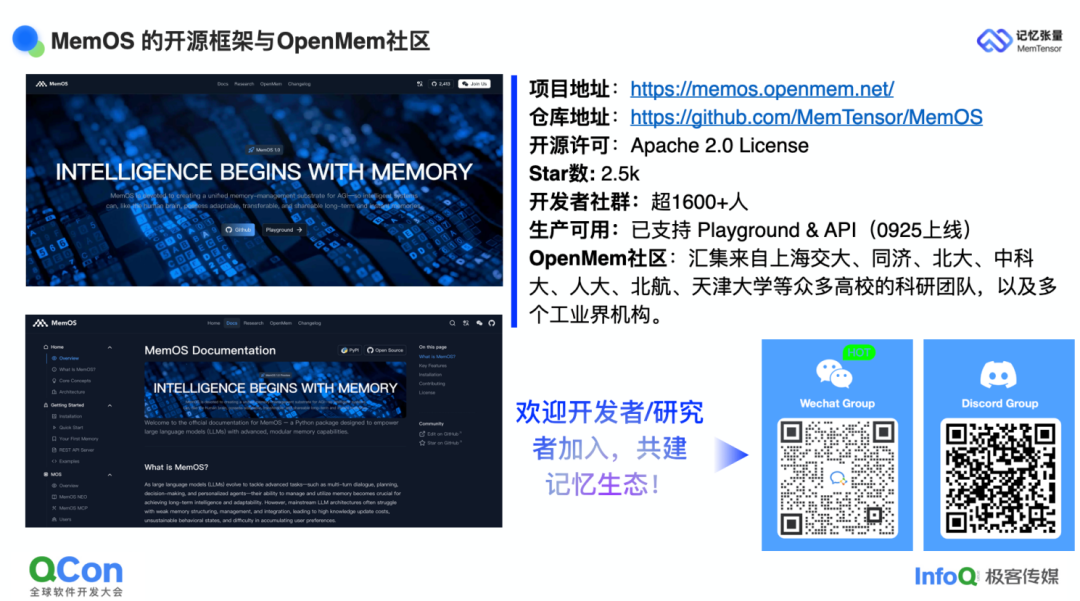 今年 7 月底,我们开源了 MemOS Preview,并发起国内首个聚焦记忆管理的开源社区 OpenMem,邀请高校研究团队与工业界伙伴共同探讨记忆技术的演进方向,沉淀通用标准与协议。开发者社区保持完全开放,API 服务框架已发布第一版,第二版将于 10 月 31 日上线,未来一年对所有调用量级与性能需求均免费,涵盖"记忆即服务"与"推理即服务"。同时提供可私有化部署的版本,满足高安全场景需求。