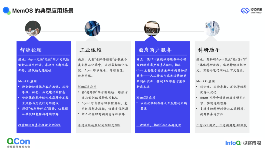 之所以打造 MemOS,源于团队自 2023 年成立至今在 ToB 项目中的切身体会。无论是智能投顾还是工业运维,客户对个性化记忆的诉求高度一致:希望把员工与 AI 中枢交互产生的公共经验固化下来。在工业现场,若资深技师退休且未带徒,其调试经验往往随人散失;企业期待记忆平台能留存"为何把参数设为 5%“这类过程信息,而非仅记录结果。开源后,已有开发者将 MemOS 应用于酒店商户服务、科研助手等场景,显著提升了人工反馈准确率与个性化服务水平。