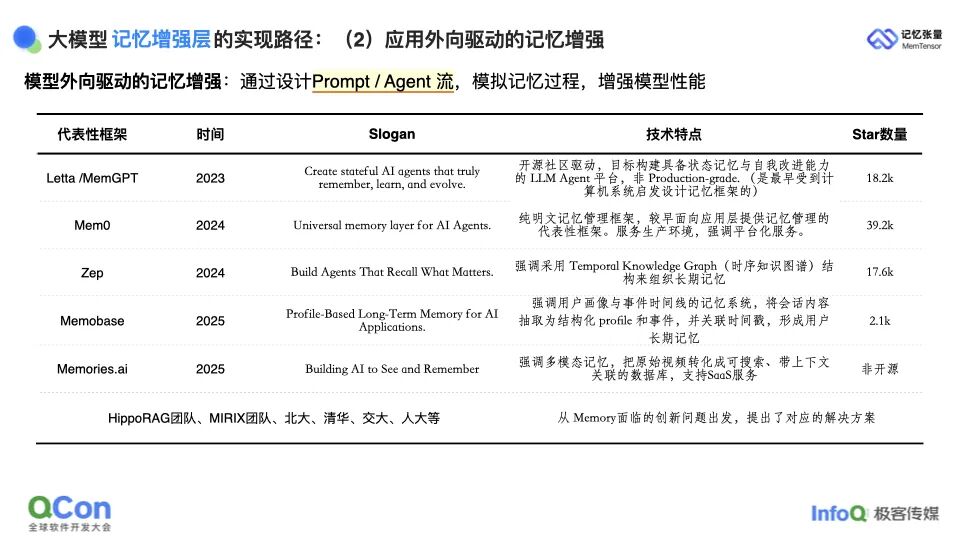 第二条则是面向应用层的工程实践:在不动基座模型的前提下,通过通用大模型、提示工程(prompt engineering)与 Agent 工作流来模拟人类对记忆的管理过程。早期项目如 MemGPT、Mem0、Zep 等开源框架均循此思路;近期 Memories.AI 更进一步,从多模态记忆角度拓展了记忆管理框架。除这些偏开源或商业化的团队外,也有不少学术团队围绕记忆工程中的单点创新提出独立方案。