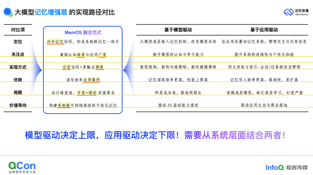 若将两条路线并置比较,二者几乎处于对立的两极。以基模为核心的方案,研发周期长、投入高;然而一旦在模型层面把记忆问题真正吃透,其性能天花板也最高,后续扩展几乎没有硬约束。反之,纯应用层的做法可在极短时间内搭出第一版记忆系统,且横向扩展灵活;但依赖通用基座模型与提示工程,往往很快触到性能瓶颈——从 85% 再往上走到 90%、95%,每一步都异常艰难。